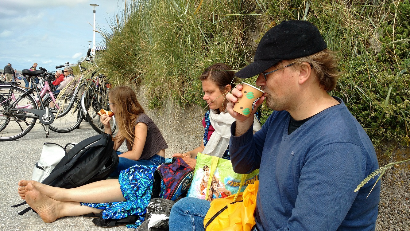 Es gibt auch andere Lichtblicke. Wir geben uns friesischen Genüssen in einer Bäckerei hin. Ich esse einen Donut und trinke Latte Macchiatto. Das Leben hat also doch Sinn.
